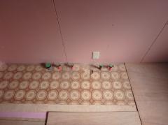 | 石油給湯器からの給湯なので、床の一部を剥がし配管をしました。 | キッチンパネルを張ります。 |