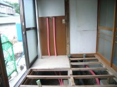 | 洗面所とお風呂の間の壁を壊しました。奥のスペースがトイレです。 | 給水給湯管と排水管の配管をします。 | 配管が完了したので、大工工事に入ります。 |
