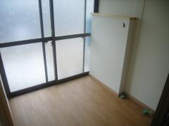 | 洗濯機用の給水給湯管配管の為、少し壁をふかすします。下地ができました。 | 床と壁のクロスを貼りました。屋外への出入り口の引き戸はそのまま生かします。 | お風呂側の壁とドア周りも綺麗に仕上がりました。 |