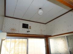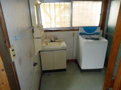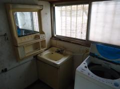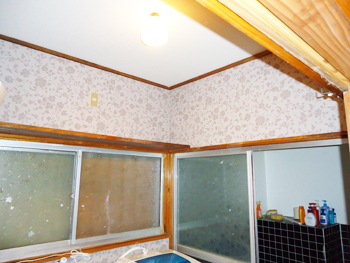 | 今までのユニットバス。壊れた蓋にテープを貼って使っていました。 | 洗面台の蛇口から洗濯機へ給水していました。 | 長年の湿気によるカビが一部発生していました。 |