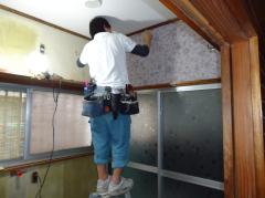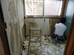 | 洗面台を取り外しクロスを剥がします。 | 天井、壁、床の順番で仕上げ材を貼っていきます。 | 洗濯機用の蛇口を新しく取り付けました。 |