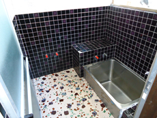 | 浴槽の小さいタイルのお風呂。 |