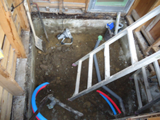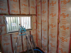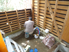 | シロアリ駆除剤の塗布と土台の補修をしています。 | コンクリートを打設します。風呂釜用のパイプも配管されました。 | 断熱材を張りつけ、窓を取り付けました。 |