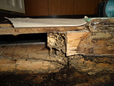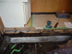 | 解体後、給水給湯管、排水管を配管します。 | 脱衣所との間の土台がシロアリの被害を被っていました。 | シロアリに侵食されています。 |
