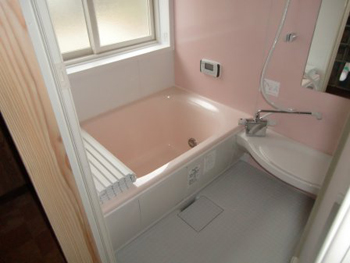 | ピンクの可愛らしいユニットバス。 | 長府の石油ボイラーも設置完了。 |
