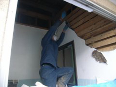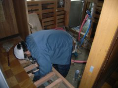 | 天井と壁をはがします。 | 写真左が下地材のシロアリによる被害。 | 建築工事で土台をしっかりと作ります。 |