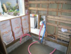 | 給水管を配管しコンクリートを流しました。 | ユニットバス業者による組み立て作業中。 | ボイラーを設置し仕上げのペンキを塗ります。 |