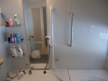 | 玄関の上り框の所には靴の脱ぎ履きのためにL型に取り付けます。 | 脱衣洗面所、トイレ前の廊下には2.8mの手すりを取り付けます。 | お風呂には洗い場での立ち座りのための手すりを取り付けます。 |