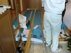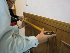 | ビスで止めた後カバーを被せて完成です。 | しっかり取り付けられているか確認をしています。 | 廊下には補強板を取り付けてから、2.8mの手すりを設置します。 |