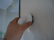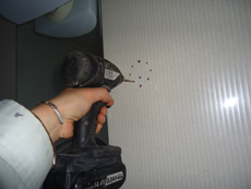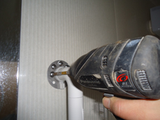 | より握りやすくするために、下半分が凸凹になっているセーフティータイプの手すり。 | お風呂の鏡の横にスライドバーを取り付けるために、まずは穴を開けます。 | お風呂の鏡の横に穴を開けます。 |