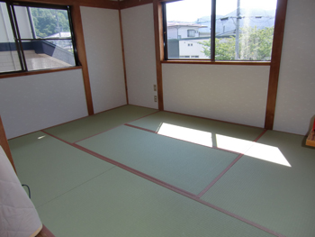 和紙製の畳に張り替えた畳リフォーム。ダイケンの健やかくんは、い草の持つやさしいあたたかな風合いをそのまま生かし、傷や汚れに強く健康にも配慮しています。色あせもしにくく、畳の美しさが長持ちします。 |