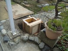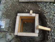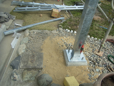 | 既存のバルコニーを残した状態で基礎工事をします。 | 土台の型枠と配筋ができたのでコンクリートを流し込みます。 | コンクリートが乾いたら、鉄柱をアンカーで打ち込みます。 |