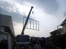 | 床のフレームを組みます。デザインの為の外壁タイルを出っ張りの上に取り付けます。 | 床材を一枚ずつ張っていきます。 | 屋根のフレームをクレーンで吊り上げます。 |
