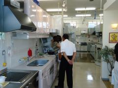 受付で記帳をお願いしています。 お手入れの楽なレンジフードを熱心にご覧になっています。 | 0.75坪、1坪、1.5坪に壁パネルが移動し、広さの違いを実感できるユニットバスです。 |
