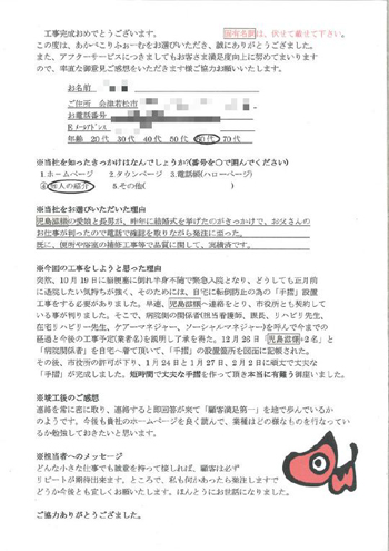 早速、児島様へ連絡を取り、市役所とも契約していることがわかりました。そこで、病院側の関係者(担当看護士、課長、リハビリ先生、在宅リハビリ先生、ケアマネージャー、ソーシャルマネージャー)を呼んで今までの経過と今後のの工事予定(業者名)を説明し了承を得た。 12月26日「児島様+2名」と「病院関係者」に自宅へ来ていただいて、「手すり」の設置箇所を図面に記帳された。 その後、市役所の許可が下り、1月24日、27日、2月2日に頑丈で丈夫な「手すり」が完成しました。 短時間で丈夫な手すりを作っていただき本当にありがとうございました。 竣工後のご感想はいかがでしょうか。連絡を常に密に取り、連絡すると即回答が来て「顧客満足第一」を地で歩んでいるかのようです。今後も貴社のホームページをよく読んで、業種はどんなものを行っているのか勉強しておきたいと思います。 |